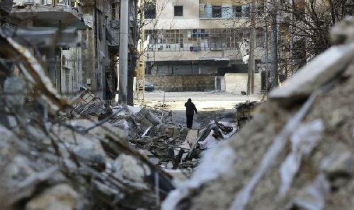 1月21日,在敘利亞北部城市阿勒頗,一名男子在建筑物廢墟間行走。(新華社/法新社)