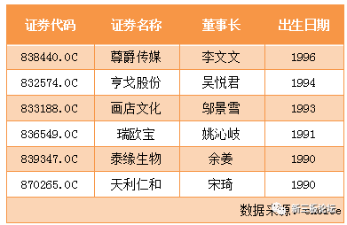 其中,年齡最小的為1996年出生的尊爵傳媒(838440)董事長李文文,年僅21歲。