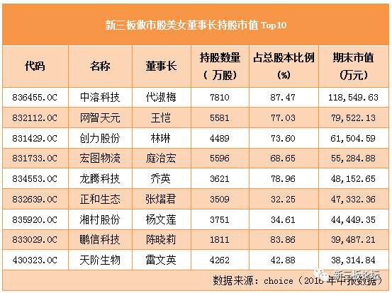 但這絲毫不影響其“最富有的新三板女董事長”的地位:截至3月7日,中溶科技收盤價為15.39元/股,總市值16.05億元,董事長代淑梅持股市值雖然降至9.28億。但若以2016年中報各女董事長持股市值來對比,代淑梅依然可以“穩(wěn)居”榜首。