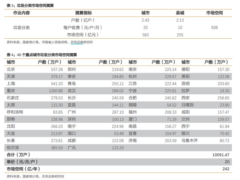 天風證券認為,垃圾分類加快推進,整體空間近千億,環(huán)衛(wèi)行業(yè)直接受益。按照城市居民每戶20元/月,縣城居民每戶10元/月的標準進行測算,垃圾分類整體市場空間在800億以上。根據住建部的要求,全國46個城市在2020年前完成垃圾分類;到2025年,全國地級及以上城市基本建成生活垃圾分類處理系統(tǒng)。46個城市對應居民戶數(shù)約1億戶,按照20元/戶/月測算,2020年前將釋放的市場空間約242億。