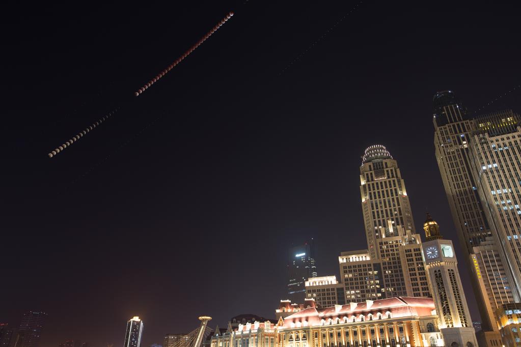 天津市天文愛好者王碩2018年1月31日在天津津灣廣場拍攝的“月食項鏈”照片。(王碩本人供圖)