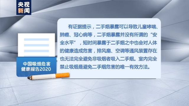 有證據(jù)提示,二手煙暴露可以導(dǎo)致兒童哮喘、肺癌、冠心病等,二手煙暴露并沒有所謂的“安全水平”,短時(shí)間暴露于二手煙之中也會(huì)對(duì)人體的健康造成危害,排風(fēng)扇、空調(diào)等通風(fēng)裝置存在也無法完全避免非吸煙者吸入二手煙。室內(nèi)完全禁止吸煙是避免二手煙危害的唯一有效方法。