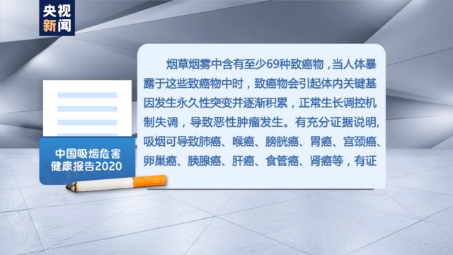 報(bào)告指出,煙草煙霧中含有至少69種致癌物,當(dāng)人體暴露于這些致癌物中時(shí),致癌物會(huì)引起體內(nèi)關(guān)鍵基因發(fā)生永久性突變并逐漸積累,正常生長(zhǎng)調(diào)控機(jī)制失調(diào),導(dǎo)致惡性腫瘤發(fā)生。有充分證據(jù)說明,吸煙可導(dǎo)致肺癌、喉癌、膀胱癌、胃癌、宮頸癌、卵巢癌、胰腺癌、肝癌、食管癌、腎癌等,有證據(jù)提示,吸煙可以增加急性白血病、鼻咽癌、結(jié)直腸癌、乳腺癌的發(fā)病風(fēng)險(xiǎn)。